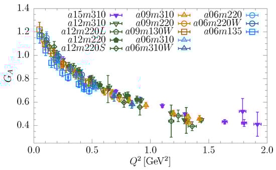 There are two ways in which one can extract the axial charge . The first is from the forward matrix element using in Equation (8) with , and the second is by extrapolating the form factor to . I am considering them as separate because the extraction from the forward matrix element is computationally clean: has the smallest errors, and the verification of the symmetry of the data about is a good test. The errors grow with , as shown in Figure 2. On the other hand, is constrained by being part of the PCAC relation, Equation (12), that has to be satisfied. The two results must agree after CCFV extrapolation. Based on the data in Ref. [19], I conclude the following: