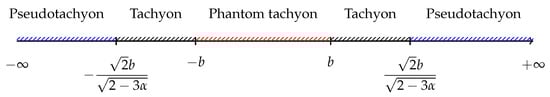 during which both the expression under the square root in the formula for the potential (28) and the expression under the square root for the kinetic structure (35) change their signs. This situation is exactly as described in [], and it corresponds to the transition from the tachyon field to the pseudotachyon one. Below, Figure 1 graphically represents the transitions between different regimes in the model with . It is easy to see that for , the transition from tachyon to pseudotachyon is absent.