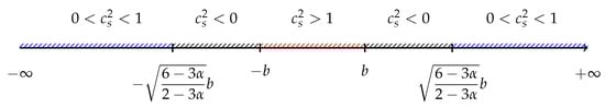 the speed of sound squared is positive if , i.e., if the pressure is positive, and it is subluminal if , i.e., the pressure is smaller than the energy density. We have seen that in any case, the inclusion of the parameter b and regularizing the metric introduces instabilities into the cosmological solutions. Such a situation looks rather natural. One can remember that, for example, in a very simple cosmological model of a closed Friedmann universe filled with a minimally coupled scalar field, for which the potential includes only a massive term that is quadratic in field, there are solutions with bounces, but they are actually unstable. This model was studied in detail by many authors; see, e.g., refs. [,,,,,,,]. Thus, it looks like a very challenging task to obtain a cosmological model with non-singular, stable evolution.