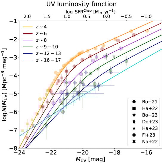 - Bouwens, R.J.; Illingworth, G.; Ellis, R.S.; Oesch, P.A.; Stefanon, M. z∼2-9 galaxies magnified by the Hubble Frontier Field Clusters II: Luminosity functions and constraints on a faint end turnover. Astrophys. J. 2022, 940, 55. [Google Scholar] [CrossRef]
