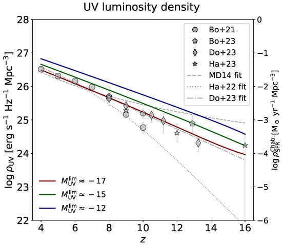 - Bouwens, R.; Illingworth, G.; Oesch, P.; Stefanon, M.; Naidu, R.; van Leeuwen, I.; Magee, D. UV luminosity density results at z > 8 from the first JWST/NIRCam fields: Limitations of early data sets and the need for spectroscopy. Mon. Not. R. Astron. Soc. 2023, 523, 1009. [Google Scholar] [CrossRef]