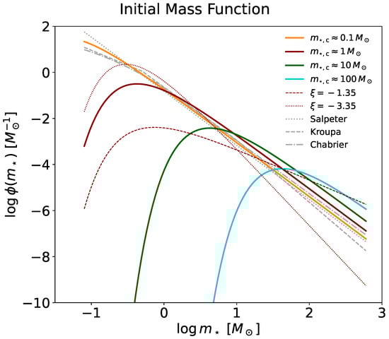 - Hennebelle, P.; Chabrier, G. Analytical Theory for the Initial Mass Function. III. Time Dependence and Star Formation Rate. Astrophys. J. 2013, 770, 550. [Google Scholar] [CrossRef]
