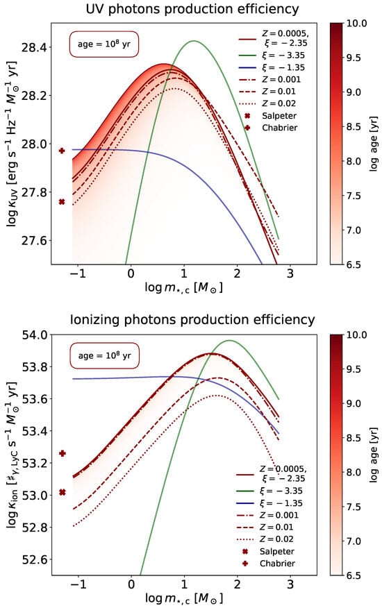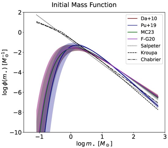 - Kroupa, P.; Jerabkova, T. The initial mass function of stars and the star-formation rates of galaxies. In Star-Formation Rates of Galaxies; Buat, V., Zezas, A., Eds.; Cambridge University Press: Cambridge, UK, 2021. [Google Scholar] [CrossRef]
