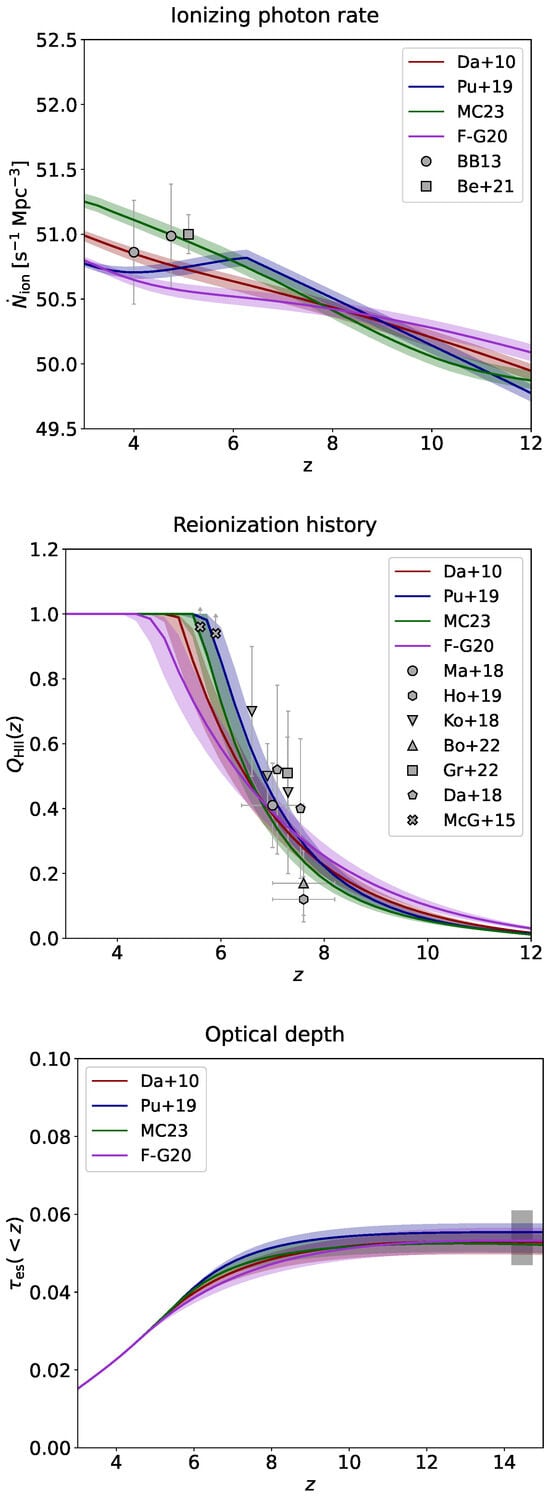 - Finkelstein, S.L.; D’Aloisio, A.; Paardekooper, J.-P.; Ryan, R., Jr.; Behroozi, P.; Finlator, K.; Livermore, R.; Upton Sanderbeck, P.R.; Dalla Vecchia, C.; Khochfar, S. Conditions for Reionizing the Universe with a Low Galaxy Ionizing Photon Escape Fraction. Astrophys. J. 2019, 879, 36. [Google Scholar] [CrossRef]