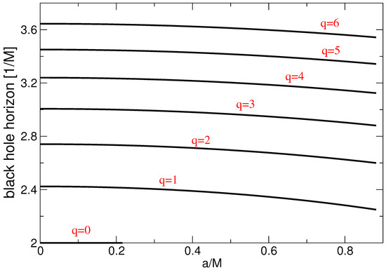 The Hartle–Thorne metric, which is an extension of the Schwarzschild metric, incorporates the effect of the rotation parameter and describes the spacetime around black holes. Figure 1 illustrates the variation in the horizon of the Hartle–Thorne black hole with respect to the black hole rotation parameter. As seen in the figure, the smallest horizon occurs at where . For , it is observed that the horizon moves away from . On the other hand, the black hole rotation parameter slightly decreases the size of the horizon. In other words, at the same q, the horizon approaches slightly. This demonstrates that the Hartle–Thorne metric behaves similarly to the Kerr metric [50].