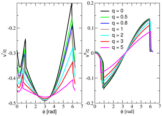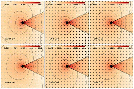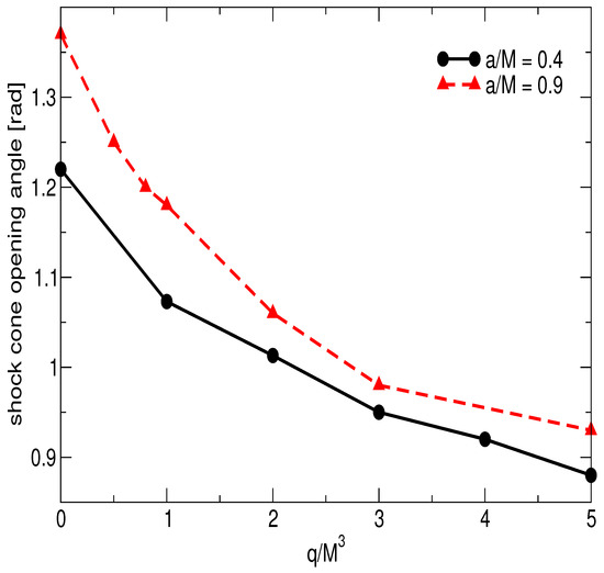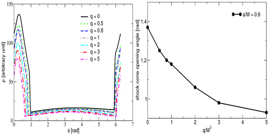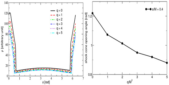 The structure of the cone formed around the rapidly rotating Hartle–Thorne black hole, as shown in Figure 7, and its dependence on the quadrupole parameter have been revealed. Here, at , the rest-mass density of the shock cone and the opening angle of the cone have been plotted for different values of q. It can be observed that the obtained results are similar to those for the slow-rotating black hole model presented in Section 4. It is clearly seen that the only difference is the larger opening angle in the rapidly rotating black hole, indicating that the black hole rotation parameter more prominently affects the cone.