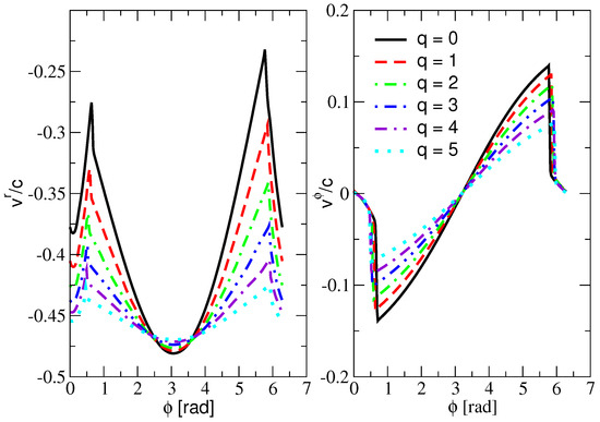 Analogous to Section 4, the variations in radial and azimuthal velocities dependent on the quadrupole parameter are plotted in Figure 8. It has been observed that the results exhibit similarities with the cone structure formed around the slowly rotating black hole. As previously mentioned, the influence of the black hole rotation parameter on the dynamic structure of the cone near the black hole horizon is clearly evident. This influence, coupled with the changing opening angle of the cone, means that the QPO frequencies around the black hole would display different behaviors.