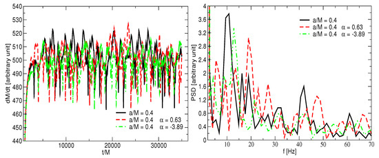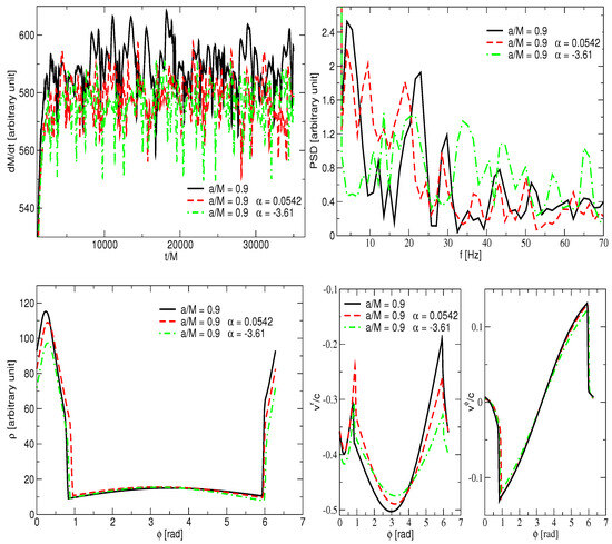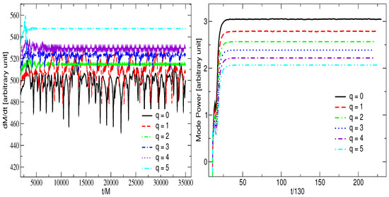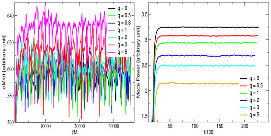 To understand the instability behavior of the shock cone, reveal its oscillation attribute, and determine the saturation time, Figure 9 depicts the mass accretion rate and the time evolution of mode power in the case of a rapidly rotating black hole, , similar to the model around a slow-rotating black hole discussed earlier in Section 4. Although the instability behaviors of the shock cone appear similar in both slow- and fast-rotating black hole scenarios, especially for large quadrupole parameters (), it is observed that the shock cone exhibits strong instability even after reaching a steady state. This suggests that, particularly for large q values, the oscillations trapped within the cone could be strongly formed and excited even after the cone reaches a steady state. This could enhance their observability, and the oscillation modes obtained for these large q values can be used to explain observational results.