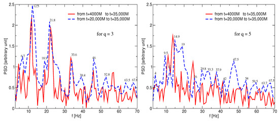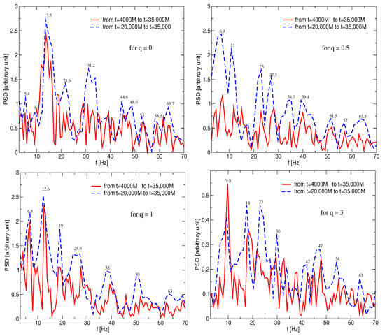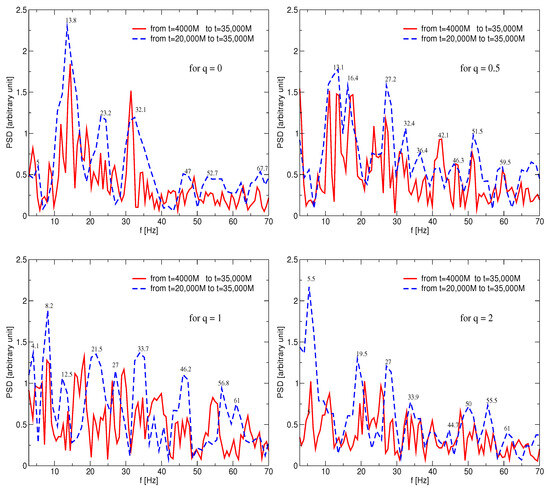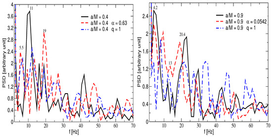 The behavior of the power spectrum density with respect to frequency is shown for after reaching steady-state conditions. A straight line is obtained from the PSD of the mass accretion rate, seen in Figure 5, throughout the simulation immediately after reaching stability, while a dashed line is obtained from the PSD of the mass accretion rate after ,. As seen, the resulting fundamental modes and their nonlinear couplings generate persistent QPOs. The first and second genuine modes are different, as are the subsequent non-linear couplings. However, in all cases presented, the formation of 1:2:3... ratios is observed.