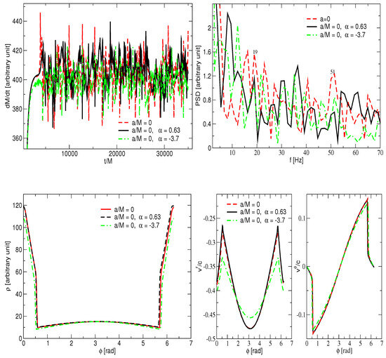 For , the change in the property of the shock cone in EGB gravities is shown. The mass accretion rate over time is given in the top left corner, while the power spectrum analysis is shown in the top right. The changes in the rest-mass density and the radial and azimuthal velocities in the azimuthal direction at are shown.