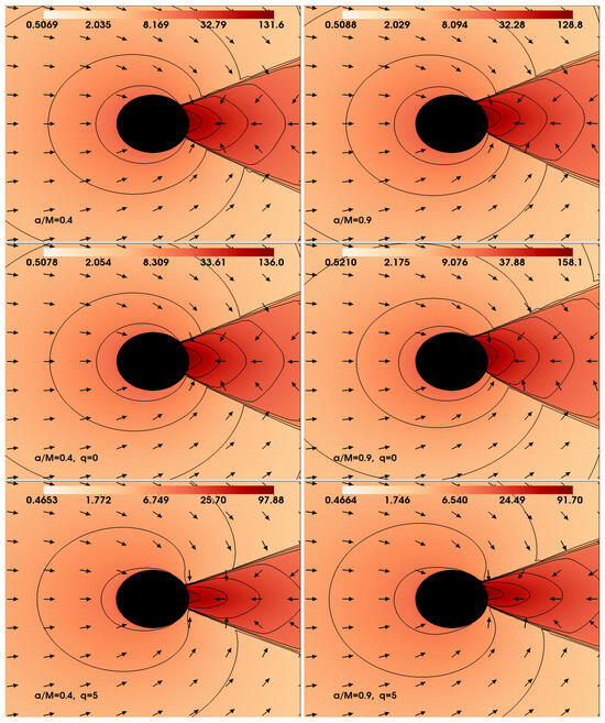 These snapshots refer to the variation in the logarithmic density and the structure of shock waves around the black hole with , depicted on the equatorial plane with color, contour lines, and a velocity vector plot. To observe the change in density and shock cones near the black hole horizon, and how they are affected by the Hartle–Thorne quadrupole parameter (q), the focus is on a region from to . This representation is plotted much later after the shock cone has reached a steady state, specifically around ,. Particularly, the influence of q on the dynamics of the shock cone is clearly visible in the region near the black hole horizon, where the gravity is very strong. The influence of q on the dynamics of the shock cone is moderate (not strong), with changes in density from ∼136 to ∼93 and at shock opening angles from to for to 5.
