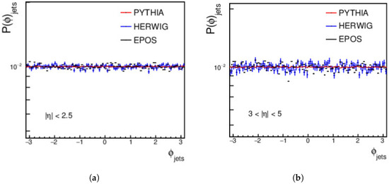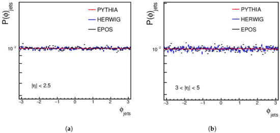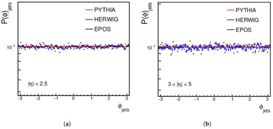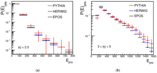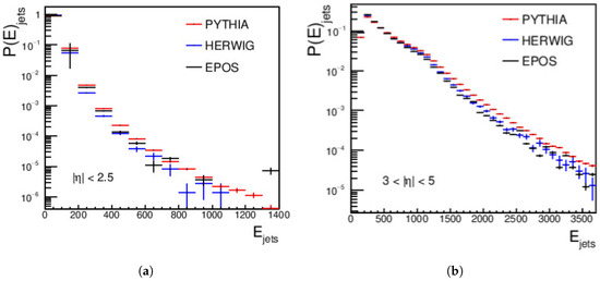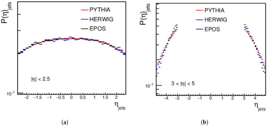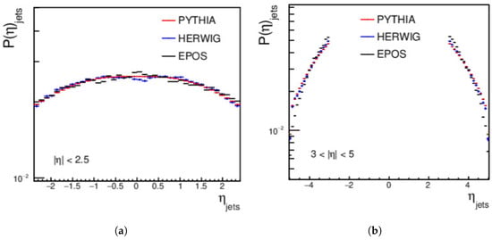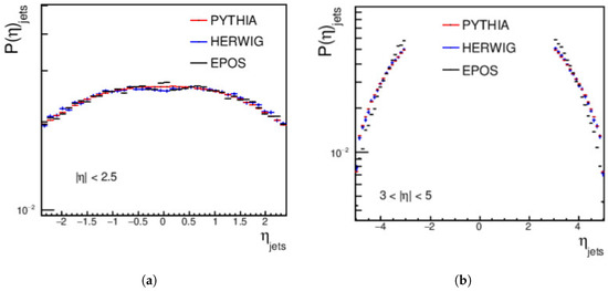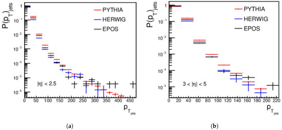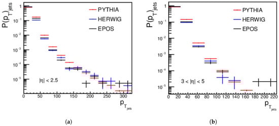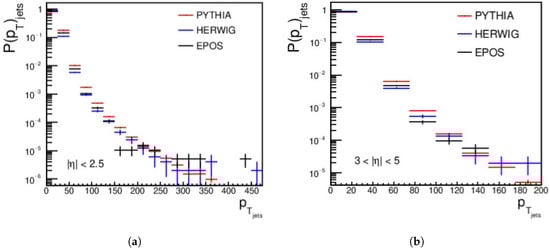 Finally, the distributions for the central and forward jets, produced from pp collisions using PYTHIA, HERWIG, and EPOS-LHC at an energy of = 27 TeV and with a minimum jet of > 15 GeV/c, are shown in Figure 3. For the central regions, a complete disagreement is shown between the three event generators. In the forward region, PYTHIA does not agree with HERWIG or EPOS-LHC, but a good agreement appears between HERWIG and EPOS-LHC from approximately 40 GeV/c to around 110 GeV/c; then, a disagreement between the three event generators occurs, as shown in Figure 3.