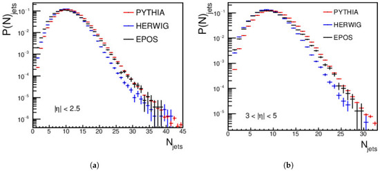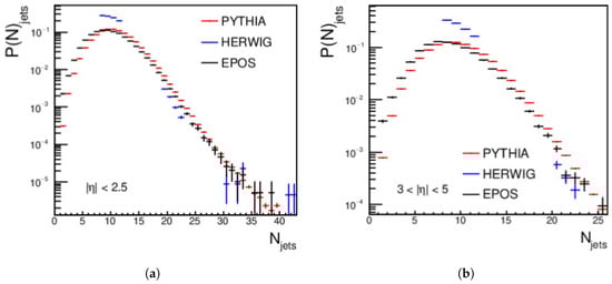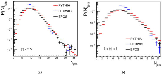 Figure 6 presents the jets’ multiplicity of the central and forward jets at energy = 27 TeV, with the same minimum jet > 15 GeV/c. The central regions show a disagreement between PYTHIA, HERWIG, and EPOS-LHC, except at the peak. PYTHIA has excess data in the central and forward regions. The jet multiplicity in the central regions is larger than that in the forward regions; this is similar to the results at = 13.6 TeV and = 20 TeV. For the forward regions, an agreement between HERWIG and EPOS-LHC appears from jet multiplicities ≈ 5–14; at the peak, PYTHIA, HERWIG, and EPOS-LHC agree with each other. Then, the spectra fall, with a clear disagreement between the three event generators.