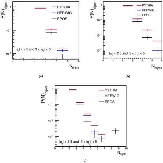 In this section, a comparison between dijets production is presented: one is the leading central jet and the other is the sub-leading forward jet with momentum > 35 GeV/c at different energies: = 13.6 TeV, = 20 TeV, and at = 27 TeV. PYTHIA, HERWIG, and EPOS-LHC event generators were used. The dijet occurrences are 2→2 parton scattering processes with a pair of jets in the final state [49]. The dijet multiplicity at the three energies starts with an agreement between PYTHIA, HERWIG, and EPOS-LHC. It is clear that the dijets multiplicity increases with increases in the energy of collision (Figure 16).