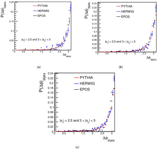 The for dijet one is leading the central jet and the other is sub-leading the forward jet, with a momentum of > 35 GeV/c at different energies ( = 13.6 TeV, = 20 TeV, and = 27 TeV); this was carried out using the PYTHIA, HERWIG, and EPOS-LHC event generators. See Figure 17. The results show that the distribution of PYTHIA is more well fitted than those of HERWIG and EPOS-LHC at the three energies of = 13.6 TeV, = 20 TeV, and = 27 TeV. Note that, as the energy of collision increases, the agreement between the results of three event generators increases. At the three energies, HERWIG has an excess of data.