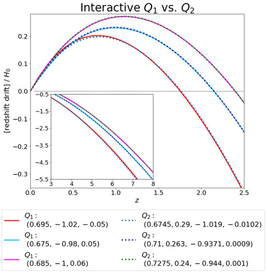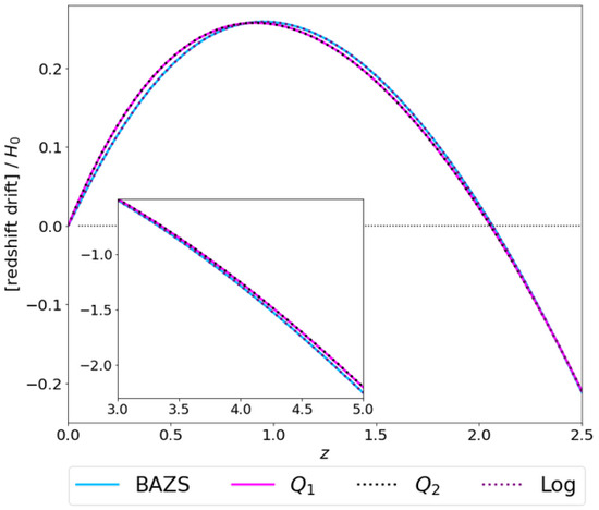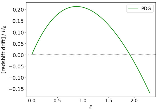 - Sandage, A. The change of redshift and apparent luminosity of galaxies due to the deceleration of selected expanding universes. Astrophys. J. 1962, 136, 319. [Google Scholar] [CrossRef]
