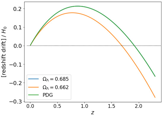 Redshift drift magnitude (per ) for two-component -CDM for different values of . Here, we have taken the values for given by the Planck2018 data release [48] (blue curve) and from Pantheon+ [49] (orange curve) plus the values previously given by the PDG data (green curve). Note that since both Planck (assuming ) and PDG have exactly the same value for , the two curves appear to exactly coincide.