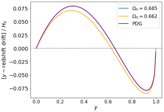 which, when using the PDG data, gives us . Given that , it is clear that this happened at values of z higher than when the universe became cosmologically constant dominated. Perhaps counter-intuitively, although the universe has to be dominated by a cosmological constant now in order for the redshift peak to exist, the light that comes to us at the peak of the RD curve was emitted before this transition happened.