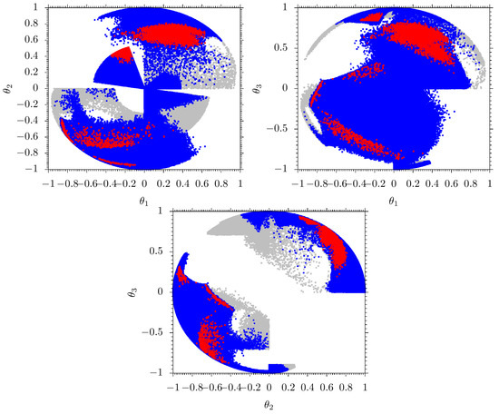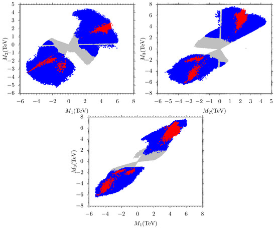 We calculate the (SSB) parameters given in Equation (2). We present the results in Figure 2 and Figure 3, color coding is the same as that of Figure 1. We present the – plane in the top left panel. Red points are in the range from [−5, 6] TeV for , but the large density favors the positive range from [4, 6] TeV. The density of red points smaller than that of the positive range was also concentrated for the negative values [−5, −2] TeV for . For the blue points, we have solutions almost everywhere for from [−5, 6] TeV except around 1 TeV. We also see the concentration of red points at [1, 3] TeV in the positive range and [−3.5, −1] TeV in the negative range for . For the blue points, we have solutions almost everywhere from [−5, 4.5] TeV for . In short, we see a polarisation kind of pattern for red and blue points having no points in the center. We present the – plane in the top right panel. We see almost a similar pattern to that of the – plane but a slight difference can be observed in that the red points are concentrated at [2, 3] TeV and [−3.5, −2] TeV for , and at [4, 7] TeV and [−2, −6] TeV for . For blue points, we have solutions for everywhere from [−5, 4.5] TeV, and for , [−6, 7.5] TeV except in the middle. In short, for all the points, we again see a similar pattern as that of the – plane. Finally, we see the – plot in the bottom panel. Similar to the two gaugino plots, here too we see a similar polarization pattern in solutions. The only difference is that since the ranges of and are relatively larger than , the plot in – looks slim.