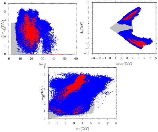 In Figure 1, we show graphs for various parameters in Equation (3). We consider and the color coding is as follows. Grey points satisfy the REWSB and yield LSP neutralino. Blue points satisfy LEP, Higgs mass bound, B-physics, and LHC sparticle mass bounds. Red points form a subset of blue points and satisfy Planck 2018 bounds on cold dark matter relic density within 5.