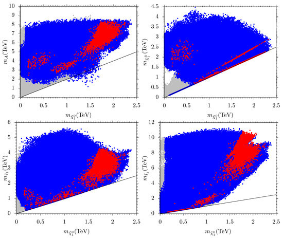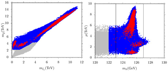 In Figure 4 we present – and – planes. The panel description and color coding are the same as in Figure 1. As we know LHC is a color particle machine and among the color sparticles, gluinos are the smoking guns for SUSY signals. As we have seen before we have heavy and also relatively heavy left-handed and right-handed scalars, consequentially we have heavy gluinos and stops. For both red and blue points, gluino mass is in the range of 2.2 TeV to 15 TeV, and stop mass is from 0.1 TeV to 11 TeV. It should be noted that at the 100 TeV collider with 30 integrated luminosity, gluino () mass can be probed up to 11 TeV and 17 TeV via heavy flavor decays and via light flavor decays, respectively, and stop () mass up to 11 TeV can be discovered [55,56,57,58]. In the right panel, we display the plot in the – plane. Here we see that both red and blue points are in the range [0.8, 9] TeV. This implies that we have heavier higgsinos.