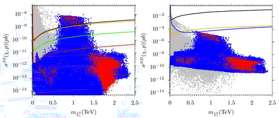 The spin-independent (left) and spin-dependent (right) neutralino–proton scattering cross-section vs. the neutralino mass. In the left panel, the solid black and orange lines depict the current LUX [66] and XENON1T [67,68] bounds, and the solid green and red lines show the projection of future limits [69] of XENON1T with 2 exposure and XENONnT with 20 exposure, respectively. In the right panel, the black solid line is the current LUX bound [70], the blue solid line represents the IceCube DeepCore [72], and the orange line shows the future LZ bound [71]. The color code in the description is the same as in the Figure 1.