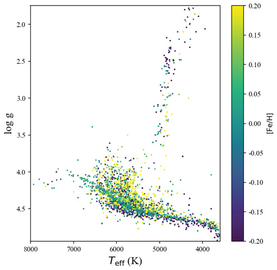 Based on these data, we have created a graphical representation of the effective temperatures () of the host star in relation to their gravitational () acceleration in order to visually discern the distribution of stellar types within the selected data set, which are shown in Figure 1. From Figure 1, we find that there is a predominance of main sequence stars, with some red giants present. The color of the data points is represented by the Fe/H values, with darker colors indicating lower metal abundance in the main stars of the sample.