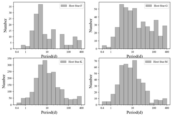 Period distribution of exoplanets whose host stellar are F, G, K, and M spectral types.