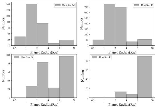 Having established the classification of stars within the dataset, we subsequently conducted a statistical analysis of the planetary constituents contained therein. Given that the search for suitable exoplanets cannot be constrained solely by stellar factors, we expanded our scrutiny beyond the stellar classifications to encompass an examination of the planets documented in our data set. G-type stars are also known as yellow dwarfs, like the Sun, but if you are looking for exoplanets, we can not just consider this single factor. We should also consider factors, such as the effect of the stellar radiant flux on the planet, the radius of the planet, and the orbital period of the planet. We have depicted the period distribution and radius distribution of transiting exoplanets around F, G, K, and M-type host stars, which are shown in Figure 2 and Figure 3, respectively, to roughly analyze the orbital distributions of planets. From Figure 2 and Figure 3, we find that the orbital period is mainly concentrated in 4–10 days, while the number of 100–400 days is less, and only the number of planets in this cycle range is higher under the K and G stellar types. As for the planetary radius, in addition to the F-type, the planetary radius of the other three type stars is concentrated in 1–4 . There are more than 90 planets whose radii are 8–20 , and whose host stars are F-type and G-type.