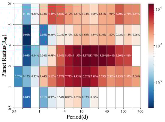 According to the IDEM method, the overall distribution of the planet formation rate for F, G, K, and M-type stars is shown in Figure 4. For the selected range of planetary radii from 1 to 20 and orbital periods from 0.4 to 400 days, the estimated planet formation rate around F, G, K, and M-type stars is 2.02%. The region with blank squares in Figure 4 represents a planet formation rate of 0. From Figure 4, we can visually observe that the planet formation rate is high for planets with radii ranging from 2 to 4 and orbital periods ranging from 10 to 100 days, indicating a higher rate of formation for planets located in the inner orbits. Conversely, the planet formation rate is lower for orbits farther from the host star. These results are likely associated with the core accretion model and disk instability model mentioned earlier.