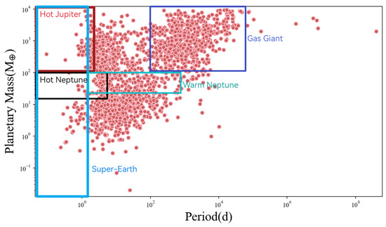Regarding the current progress in planet classification, it can be divided into single-parameter classification, multi-parameter classification, and habitability classification. Single-parameter classification involves categorizing planets based on their mass. In the classification of mass, Michael2 found values ranging from kg to kg [21]. Multi-parameter classification, building on mass differentiation, incorporates compositional classification. Stern and Levison [22] classify planets by mass into sub-dwarfs, dwarfs, sub-giants, giants, and supergiants. They further categorize planets based on composition, primarily focusing on rock, ice, and hydrogen. The final determination of a planet’s type is based on its mass and composition. Habitability classification, such as the PHL’s habitability classification, not only considers whether a planet is habitable but also categorizes habitable planets into sub-Earth-sized, Earth-sized, and super-Earth-sized types. Even within habitable terrestrial planets, further classification is necessary, particularly as slight variations in the abundance of certain elements can significantly impact habitable conditions [23]. For instance, concerning metallicity, stars with low metallicity have higher luminosity and effective temperature compared to stars of the same mass but with high metallicity [24], which subsequently affects the temperature of surrounding planets and the range of the habitable zone. Based on the data of confirmed exoplanets released by the NASA Exoplanet Archive, we conducted a simple planet classification according to a single parameter, as shown in Figure 5. As can be seen from this, in the data we analyzed, the number of super-Earths and giant planets is the largest, while the number of terrestrial planets is very rare.