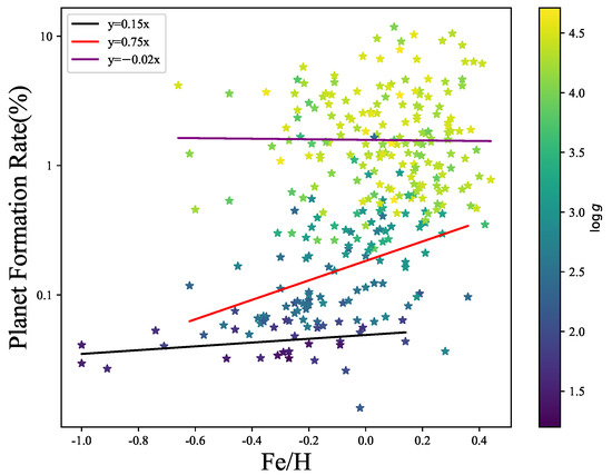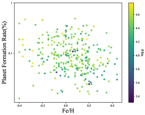 Early studies on the formation rate of giant planets were primarily conducted through radius velocity detection projects and the Kepler space telescope. The planet formation rate of giant planets with orbital periods shorter than a few years around solar-like stars is approximately 0.10, as Cumming et al. [25] suggested that the planet formation rate of giant planets with masses in the range of 0.3–10 ( is a Jupiter mass) and orbital periods ranging from 2 to 2000 days around solar-like stars is approximately 0.105. In the exoplanet statistics from Kepler, the planet formation rate for planets with a radius between 1 and 20 and orbital periods between 0.5 and 400 days around F, G, K, and M-type stars is estimated to be 0.23 ± 0.06 [26], while the formation rate for giant gas planets is estimated to be 0.16 ± 0.015 [27]. In the context of the core accretion theory, heavy elements are essential for the formation of dust particles and minor planets that constitute the core of a planet. Consequently, protoplanetary disks rich in metals exhibit a higher surface density of solid materials, facilitating the more effective formation of rocky cores for gas giant planets [28]. Extensive research indicates that metal-rich stars are more likely to host neighboring giant planets, and the occurrence rate of such neighboring giant planets increases with the enhancement of metallicity [29]. So we observe the correlation between the metallicity and formation rate of giant planets but we did not find a conspicuous direct proportionality between the two variables in this question. Therefore, we hypothesize that there are other factors influencing the relationship between the two variables, leading us to introduce stellar surface gravity as an additional factor. This raises an issue that merits further discussion. According to the literature [14,19,20], the relevant formula for neighboring giant planets is as follows: