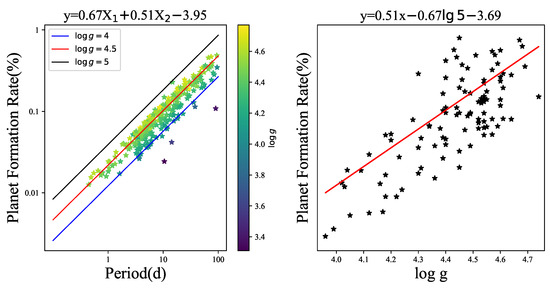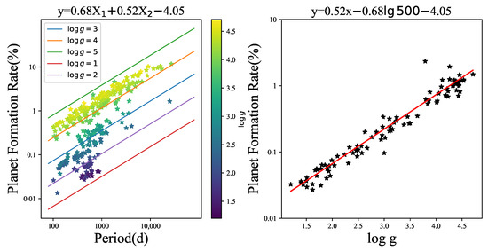 To substantiate this theory, we selected the sample interval with the highest number of samples, specifically from 300 d to 400 d, and then took the median value of 500 d to conduct a fit using the fitting formula calculated in the left panel of Figure 7. We found that the resulting fit perfectly matched the trend of the sample points within the chosen sample interval, which indirectly corroborates the validity of the theory in question, that is, for planets with identical periods, their formation rate is positively correlated with the gravitational () acceleration of their host star (as shown in the right panel of Figure 7).