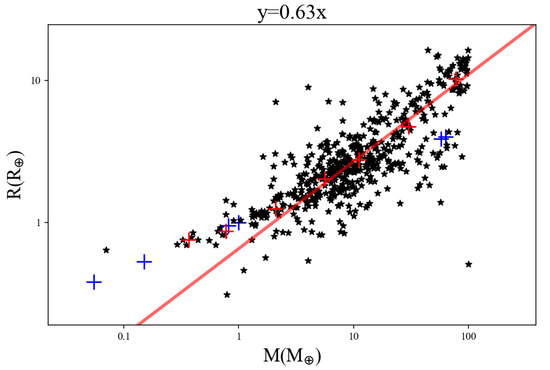 The correlation between the mass and radius of minor planets, the red plus sign indicates taking the bin and the blue plus sign indicates planets within the solar system.