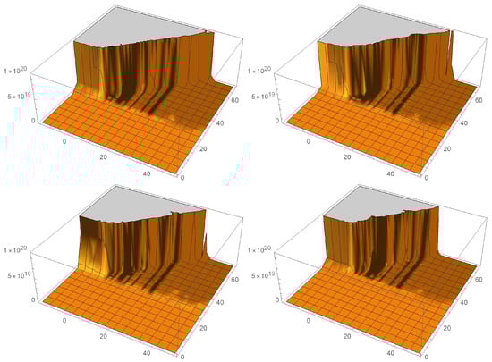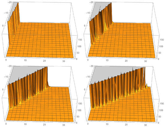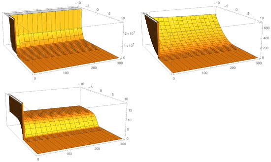 In the following, we present the quantum behavior to post-inflation-like case , then , taking the value in the non-commutative parameter for different values in the factor ordering parameter . In Figure 5, it can be observed that in a very small interval in the evolution of the scalar field, the probability density presents a mountain, which fades in the direction of the scalar field to a constant plateau. The behavior of the constant plateau for this stage of the universe was found in the commutative part in paper [] using the Mittag–Leffler functions; now, they are obtained under this solution in power series of the scalar field and the modified Bessel functions of the case.