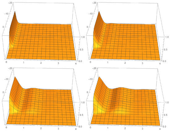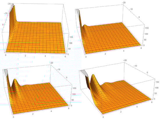 In the following plots, we show the behavior of the probability density of Equation (62), considering the sign in , taking the values , and , respectively.