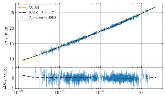 Apparent magnitudes of SN1a from the Pantheon+ analysis [28] overlaid with the apparent magnitudes of a flat-CDM model and a CDM model with . The residuals from the CDM model are shown below. The alternative model is seen to follow the expansion history of the Universe in fairly good agreement with the SN1a data. The small kink at is due to the finite steps used in z.