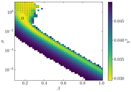 In Figure 2, we present a parameter scan over a wide range of values from to 1, and we vary the normalization parameter . We select a range of values in fair agreement with the data (within of the best of the CDM model). All model parameters outside this range are color-coded white. We note a few areas of interest, all with values in the range between and . The point with a black square at is the model from Figure 1.