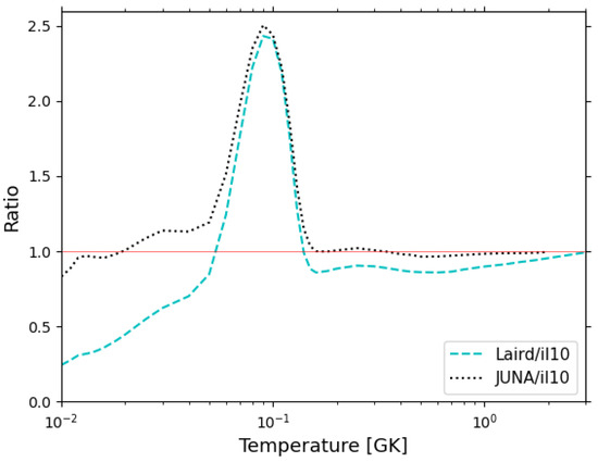 26Al in CCSNe is usually produced between explosive Ne and C zones. In our models, 26Al is synthesized at temperatures between 2.60 and 1.74 GK. It is clearly visible in Figure 2, which shows the 25Mg(p, )26Al nuclear reaction rate ratio between [2,20], how, in this temperature range, the rate from [2] is very close to the rate from [20], while it is between two and three factors lower at the lowest temperatures. This is mainly due to the shifted resonance energy computed when taking the atomic binding into account, as described in [2], while this effect was not included by [20].