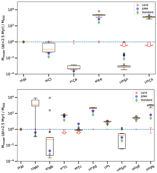 Ratio of decayed model ejecta, , and ESS observation, , for each isotope examined. Within these figures, the horizontal dashed line represents the threshold value of 1. The red error bars represent the error in the ESS ratio of the SLR in question; if the ESS ratio is given as an upper limit, a downward arrow is used. The isolation time for each model is given in the x-axis label as , and f is calculated using 26Al. Box-plots in these plots are the 20ejecta of [12]. The upper panel shows isotopes with T1/2 ≤ 2.620 × 106 yr (the T1/2 of 60Fe), and the lower panel shows isotopes with T1/2 ≥ 2.620 × 106 yr. In line with the definition of a box-plot, the box size shows the range of values between the 25th and the 75th percentile of all the models in the dataset. The error bars on the box-plot denote the lower (upper) quartiles and are given by subtracting (adding) to the position of the 25th (75th) percentile 1.5 times the interquartile range (i.e., the box size). All values above (below) these thresholds are plotted as outliers. Outlying models outside the outer quartiles are shown as small circles for both decayed and undecayed results, using the same colour scheme as the boxes.