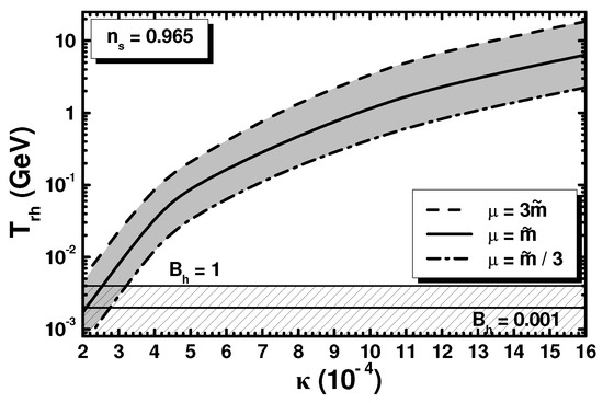 - Şenoğuz, V.N.; Shafi, Q. Reheat temperature in supersymmetric hybrid inflation models. Phys. Rev. D 2005, 71, 043514. [Google Scholar] [CrossRef]