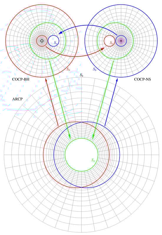 For binary configurations, the hypersurface is covered by at least three coordinate systems, as explained in detail in [,,,]. As an example of a general binary system, we show in Figure 1 a black hole–neutron star ( cross-section) that consists of the following: (i) Coordinate system COCP-BH (top-left coordinate system) centered around the black hole extending from an inner sphere (small black circle at its center) of radius to a sphere of radius (red outer circle). The surface denotes the black hole region and is excised from the grid. If M is the mass of the system, we have while ; (ii) Coordinate system COCP-NS (top-right coordinate system) centered around the neutron star, which extends from to a sphere of radius (blue outer circle). Both COCP-BH and COCP-NS contain an excised sphere (although we use the common symbol , these spheres are different in the two coordinate systems), which is introduced to improve the angular resolution and reduce the number of multipoles for resolving the companion object in a given coordinate system; and (iii) Coordinate system ARCP, which is positioned at the center of mass of the system and extends from an inner sphere of radius (green inner circle) to an outer sphere of radius (outer black circle). Definitions of the parameters for the grid setups are listed in Table 2.