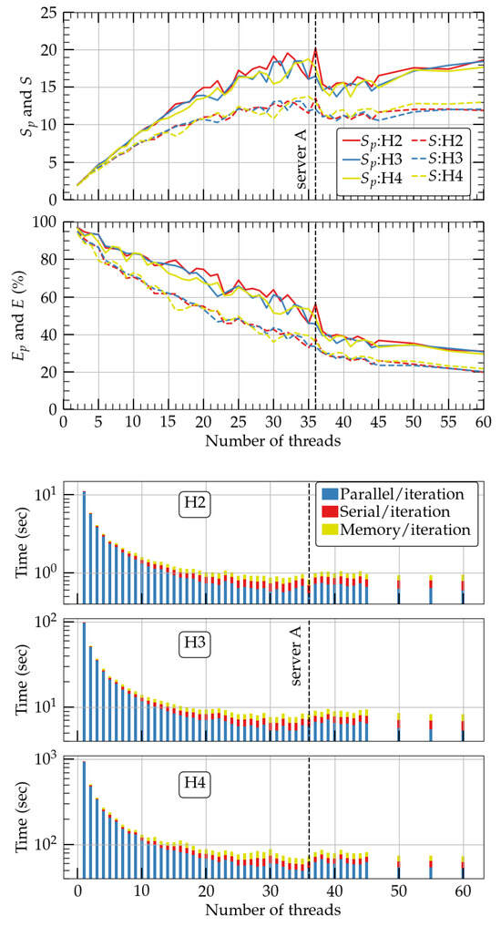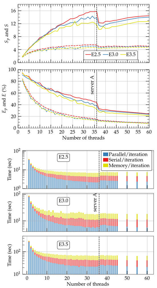 The speedup and efficiency refer to the parallelized part of code (which constitutes the large majority of the solver), while and refer to the total speedup and efficiency, which include the serial parts of the code, the input/output, and memory handling. Note that for the tests performed in this paper, the input/output routines were neither optimized nor minimized (for diagnostic purposes), and thus, the total speedup shown underestimates the real one.