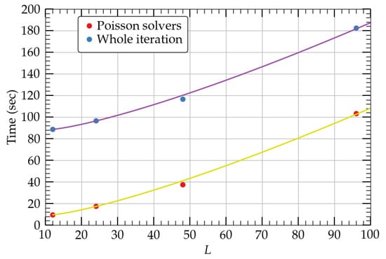 Compact systems (i)–(v) employ different mathematical formulations that nevertheless share common characteristics. For example, one well-known method for the calculation of initial data [] is the Isenberg–Wilson–Mathews (IWM) [,,,] formulation, where the spatial three-dimensional metric is assumed to be conformally flat and the trace of the extrinsic curvature is zero. This method is applied from rotating neutron/quark stars [,] to binary black holes [,,] and binary neutron stars [,] and results in five elliptic equations, i.e., a truncated system of the Einstein field equations. Notwithstanding the approximate nature of the method, its robustness and accuracy (especially for neutron stars) make the IWM method a workhorse in initial data construction. On the other hand, more intricate methods have been developed that can treat the full Einstein system, both for neutron stars and black holes. In [], rotating axisymmetric or triaxial neutron stars were computed using the waveless method [,], while in [,,], this method was employed to calculate generic magnetized equilibria with mixed poloidal and toroidal magnetic fields as well as a force-free magnetosphere. In [,], the same method was used to compute binary neutron stars in quasicircular orbits. This method is referred to as the “waveless” formulation. For spacetimes that contain a black hole, a new method has been developed in [] that solves the complete initial data equations. Contrary to the IWM method, the formulations that try to address the whole Einstein system [,] result to a significantly larger number of elliptic equations. For neutron star spacetimes [], we have fourteen nonlinear Poisson-like equations, with four of them resulting from imposing gauge conditions. For black hole spacetimes, we have a total of seventeen equations, with four of them resulting from imposing gauge conditions and another three being used for an additional decomposition of the extrinsic curvature []. The inclusion of magnetohydrodynamics will increase the total number of elliptic equations to be solved even more. Therefore, it is evident that in order to be able to study these astrophysically realistic systems in a systematic manner, an efficient parallelization scheme for the COCAL code needs to be developed.