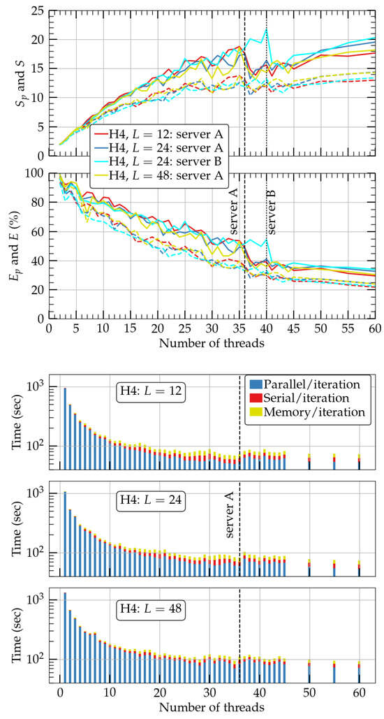 Most of the runs have been performed in server A, which has 36 cores with 2 threads per core (72 threads total) and an Intel(R) Xeon(R) Gold 6254 CPU 3.10 GHz (Intel, Santa Clara, CA, USA). We have also used server B, which has 40 cores with 2 threads per core (80 threads total) and an Intel(R) Xeon(R) Gold 6242R CPU 3.10 GHz. Both servers are dual-socket. An Intel compiler (2021.3.0 20210609) is being used.