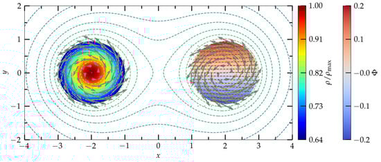 ( are coordinates with respect to the quark star center) in Equation (31), and solving Equations (10)–(12), (31), (35) and (36), we compute here a spinning binary quark star at separation and Arnowitt–Deser–Misner mass of . The quasilocal spin [] of each companion is along the axis of orbital motion. This spin angular momentum corresponds to an approximate dimensionless spin of . In Figure 6, we plot the rest mass density (left quark star), velocity potential (right quark star), contour plots of the conformal factor (green dashed lines), and velocity potential (brown dashed lines), as well as the fluid velocity with respect to the corotating frame. The direction of the velocity arrows show that the spin angular momentum is along the positive z-axis (contrary to the irrotational case) in accordance with Equation (50). From the density colorbar, we see that the central density is approximately times the surface density . The nonzero surface density is characteristic of the self-bound quark stars, contrary to their neutron star analogs. For nonspinning (irrotational) binaries of the same surface density (and rest mass), the central density is higher and . This behavior is similar to binary neutron stars as well as to isolated rotating neutron/quark stars. Note that in order to find the quasiequilibrium solution, a root finding method over the central quark star densities is needed, and therefore, a number of cycles (∼10) of Algorithm 2 is performed. Pointwise comparison between PCOCAL and COCAL solutions show differences ≲ for all variables.