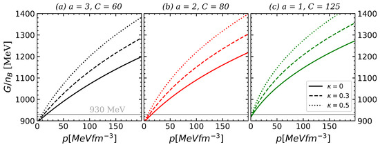 Gibbs free energy per baryon, , as a function of pressure p for different parameter sets labeled (a–c). Within each panel, three values of the excluded volume parameter are considered: solid lines represent point-like particles (), dashed lines correspond to , and dotted lines correspond to . The horizontal line at 930 MeV indicates the energy per baryon in 62Ni, serving as a benchmark for stability against decay into normal nuclear matter. Note that within each panel, all curves coincide at (see the discussion in the text for further details about this issue).