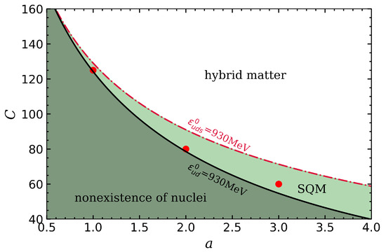 Figure 2 presents the stability window of quark matter as determined by the parameters a and C. As previously explained, the value of the Gibbs free energy per baryon at zero pressure does not depend on the value of . Therefore, the stability window shown in the figure holds for any value of the excluded volume. The plot includes two significant curves. The solid black curve labeled represents parameter values at which at zero pressure is exactly 930 MeV for two-flavor quark matter. The dashed red curve labeled corresponds to parameter values where at is exactly 930 MeV for three-flavor quark matter. The light-green shaded area in between indicates the parameter values for a and C where three-flavor quark matter is more stable than the most tightly bound atomic nucleus, and two-flavor quark matter is less stable than this nucleus (strange matter hypothesis). The EOS models represented by these parameters support the possibility of self-bound quark matter without contradicting the existence of atomic nuclei. Within this region, we have selected three sets of parameters that will be used for the calculations in the following figures, which are identified by red dots in the stability window. The dark-green region corresponds to parameter values where two-flavor quark matter (in bulk) is more stable than the most tightly bound atomic nucleus. This area represents a scenario where atomic nuclei could decay into a single bag of deconfined u and d quarks, which is not observed in Nature. Additionally, it is important to note that throughout the stability window, the energy per baryon for matter with three flavors always remains lower than for two-flavor matter, meaning that the present model does not support the existence of absolutely stable two-flavor matter. This means that in the current model, the dark-green region represents a scenario where nuclei would ultimately decay into small bags of quark matter consisting of u, d, and s quarks. One might speculate that the parameters of the dark-green region are physically viable because the existence of such small hypothetical configurations might be practically suppressed by large surface and curvature tensions. In such a scenario, self-bound quark matter would be possible in bulk but suppressed within nuclei. Yet, this paper opts for a more restrictive approach, considering the dark-green area as unphysical. In the white region, the parameters a and C render both two- and three-flavor quark matter less stable than the most tightly bound atomic nucleus. Here, quark matter could only exist within the core of compact stars, leading to the formation of what are known as hybrid stars. The range of a values depicted ensures that the speed of sound is always lower than the speed of light throughout the figure.