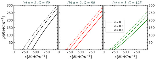 Pressure p as a function of the energy density for the same sets of model parameters as shown in Figure 1. In panel (a), the curves exhibit concave downward behavior; in panel (b), they are straight lines; and in panel (c), they are concave upward. As the value of increases, the EOS becomes stiffer.