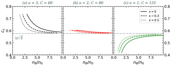 The speed of sound is shown in Figure 4 for the same parameter choices as in previous figures. In every scenario, approaches the conformal limit, where asymptotically. Since the pressure approaches zero at a finite density, we truncate the curves at the density where . Notice that for , decreases with increasing ; for , it remains nearly constant; and for , it increases with . We have numerically confirmed that this change in behavior is directly associated with the parameter a (linked to the quark–quark interaction potential), while the parameter C plays a minor role in this feature. This transition in behavior is observed very close to . When is a decreasing function of the density (panel a), we observe that as the value of the parameter grows, is smaller for a given density. Conversely, when rises with the density, an increase in the value of leads to a higher speed of sound at a given density. These differences disappear at asymptotically high densities, where all curves ultimately converge.